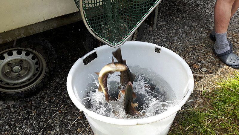 Die Fische werden vom Heberlein wie immer in speziellen Transportbehältern geliefert. Sie verfügen über eigene Sauerstoffanlagen, die die Forellen während des Transportes mit ausreichend Sauerstoff versorgen.